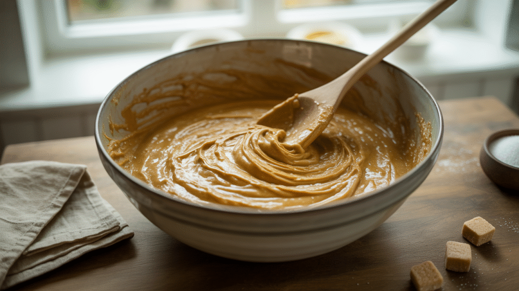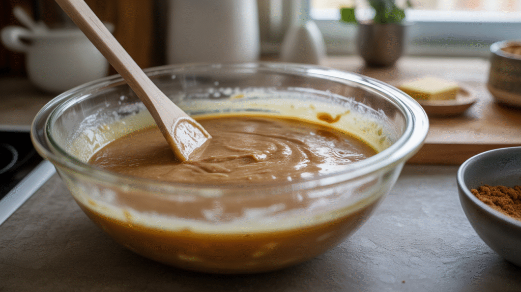 - Whisk melted butter and brown sugar in a large bowl until smooth and glossy.