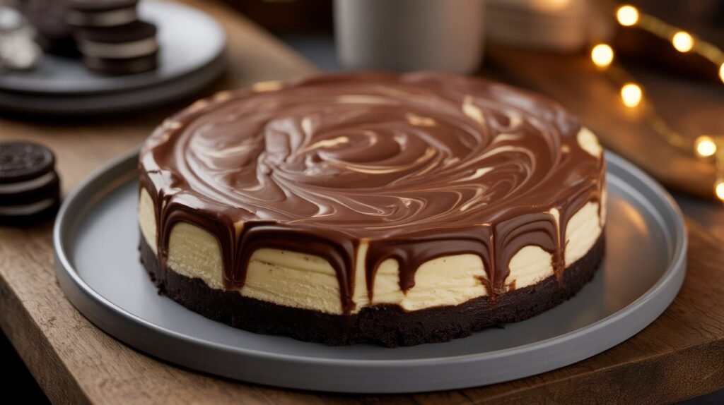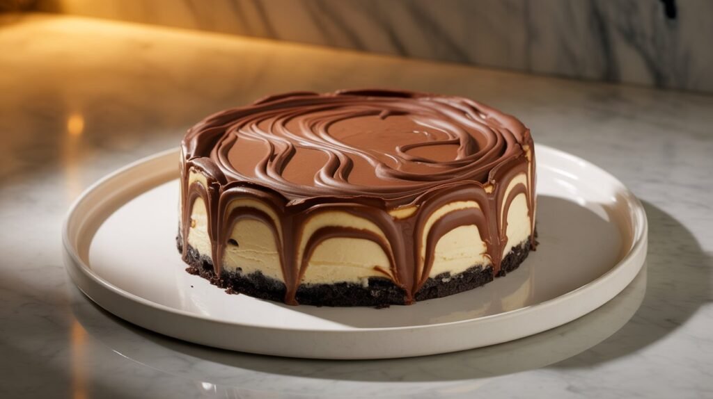 8. Finish: Pour ganache over chilled cheesecake and spread evenly. Chill 20–30 minutes before slicing.