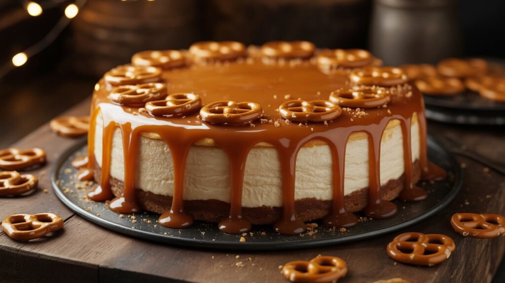 8. Finish: Pour caramel over chilled cheesecake, allowing it to drip over edges. Sprinkle crushed pretzels on top.