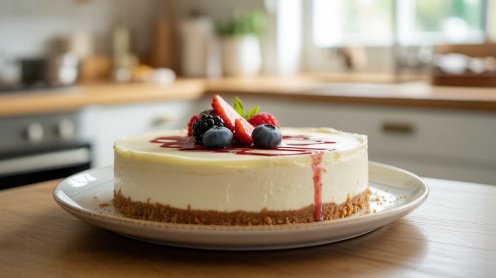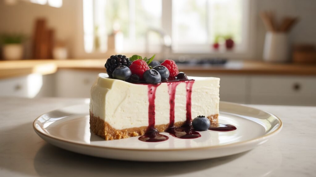 If you’re new to no-bake cheesecakes, this classic vanilla version is the perfect place to start. It’s silky smooth, lightly sweet, and perfectly balanced with a buttery graham-cracker crust. The texture is creamy yet firm enough to slice cleanly—just like a traditional cheesecake, but without any baking, cracking, or water baths.