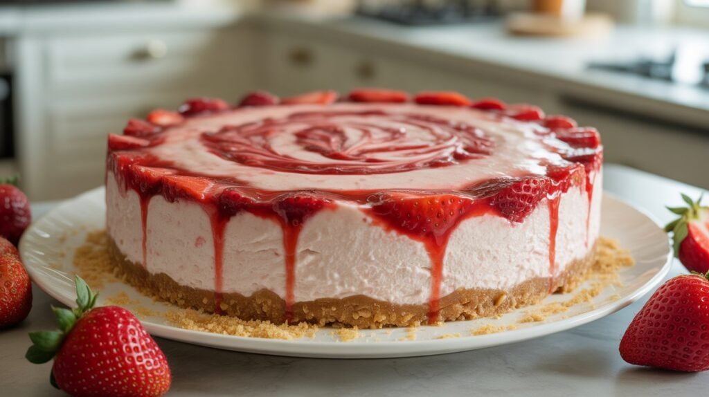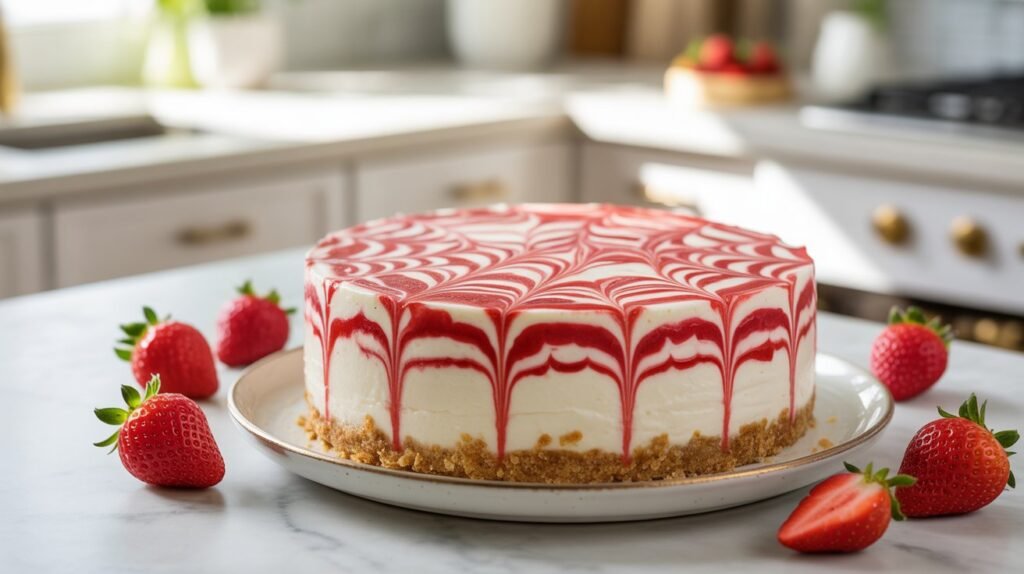 This No-Bake Strawberry Swirl Cheesecake is the perfect blend of creamy vanilla filling and vibrant, fruity strawberry puree. The beautiful swirl design on top makes it look bakery-made, but it’s surprisingly easy—no baking, no water bath, no hassle. The strawberry flavor adds a refreshing brightness that pairs wonderfully with the rich, silky cheesecake base.