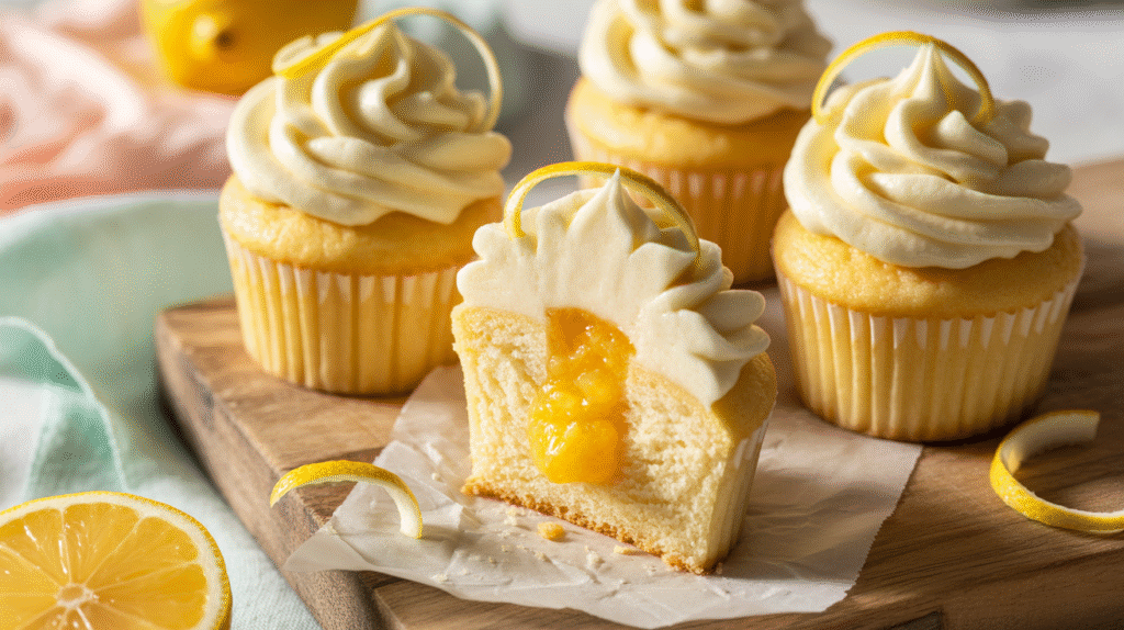 These Moist Vanilla Cupcakes with a bright, tangy lemon curd filling are the perfect combination of soft, sweet, and citrusy. Each cupcake features a fluffy vanilla base, a hidden pocket of creamy homemade lemon curd, and a swirl of smooth vanilla buttercream on top. The result is a delicious flavor contrast that feels refreshing, vibrant, and bakery-level impressive